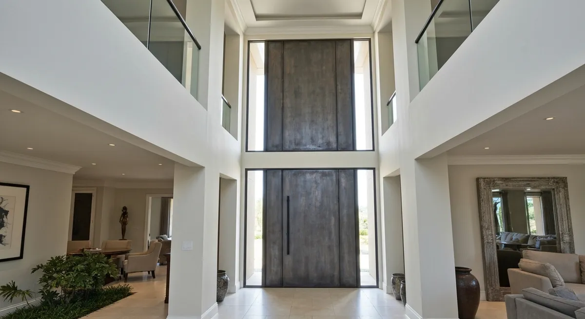 Частные дома с высокими потолками. Коттеджи и таунхаусы в Алматы всё чаще проектируются с потолками 3–4 метра. Пропорционально растёт и высота входного проёма — дверь 2000 мм в проёме 3200 мм выглядит нелепо и требует массивной заделки сверху.